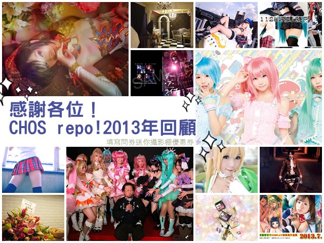 各位早安午安晚安,我是管理人阿巧。2014年已經開始囉!CHOS repo! 感謝各位讀者在過去一年的愛護,2013年裡CHOS repo 撰寫了超過170篇COSPLAY文章,籌劃了5個特輯募集企劃,參與過10場大大小小的海內外COSPLAY活動,也感謝各位的支持與幫助才能讓CHOS repo!的內容這麼的充實。